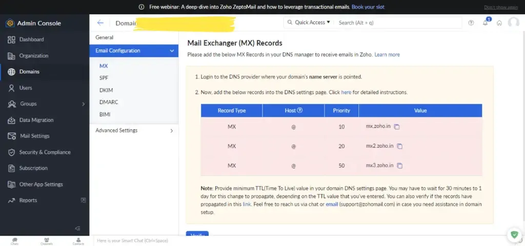 - Copy the following DNS Records provided by Zoho Mail in DNS Mapping.