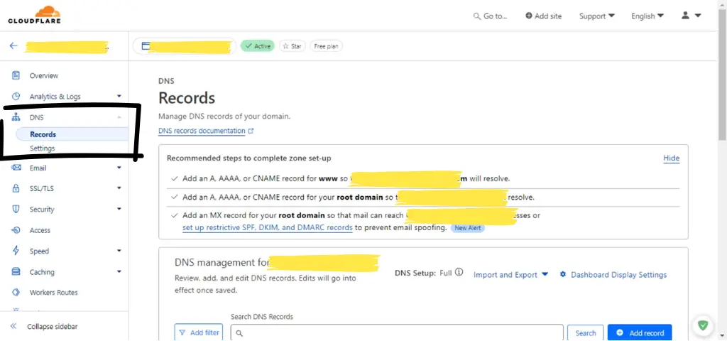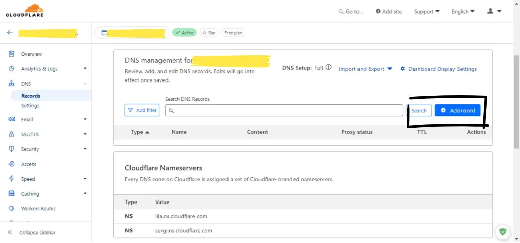 - Go back to Cloudflare dashboard and find DNS option in left sidebar.